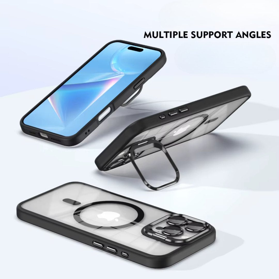 Coque achetée depuis quelques semaines, et elle tient parfaitement. Je suis souvent en déplacement, donc le support intégré m’aide beaucoup pour les appels vidéo. Et le MagSafe fonctionne parfaitement avec mon chargeur." – Laura G.